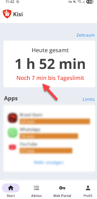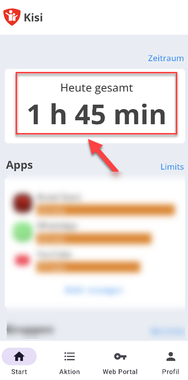 1.) Nehmen Sie bitte selbst das Kindergerät zur Hand und starten Sie die Kisi App. Wird dort die gezählte Zeit für den heutigen Tag richtig angezeigt? (Screenshot) Es ist wichtig, dass Sie das selbst (d.h. persönlich!) auf dem Kindergerät prüfen, um mögliche Manipulationen oder Fehlfunktionen auszuschließen.