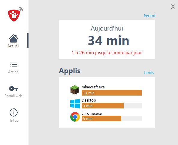 Les paramètres dans le Portail Web se synchronisent avec les paramètres directement sur le PC de l’enfant à intervalles réguliers courts (<3 minutes). À la fois dans le Portail Web (sur la page d’accueil) et sur le PC de l’enfant (cliquez sur l’icône, puis à gauche sur Détails), vous pouvez voir l’heure de la dernière synchronisation réussie.